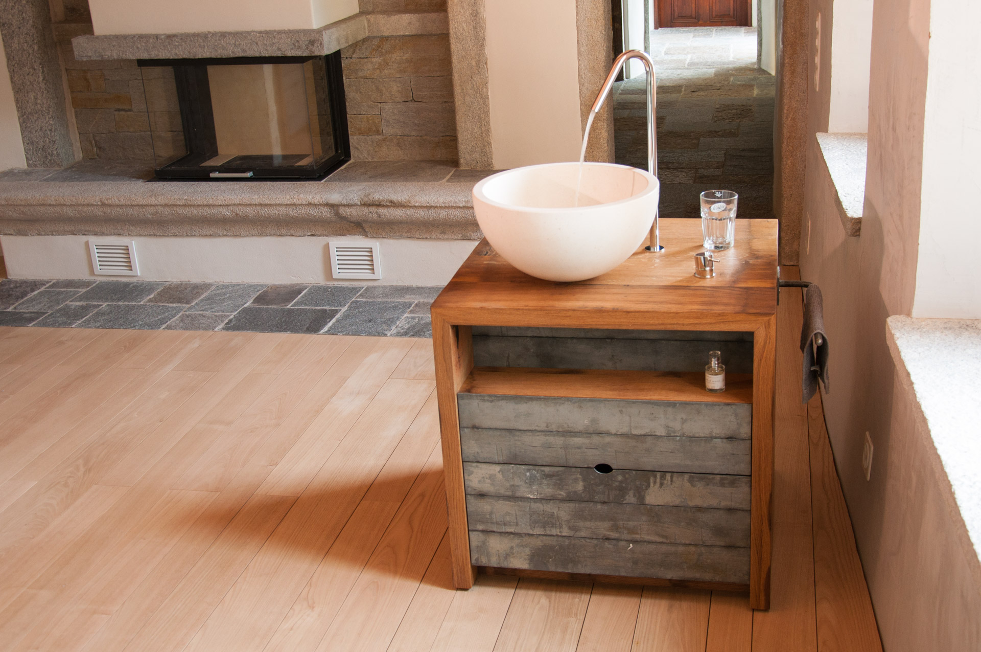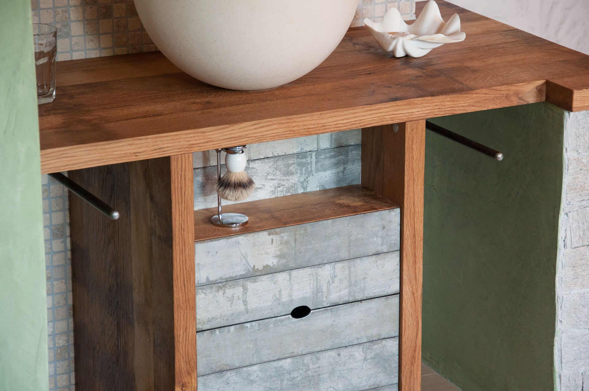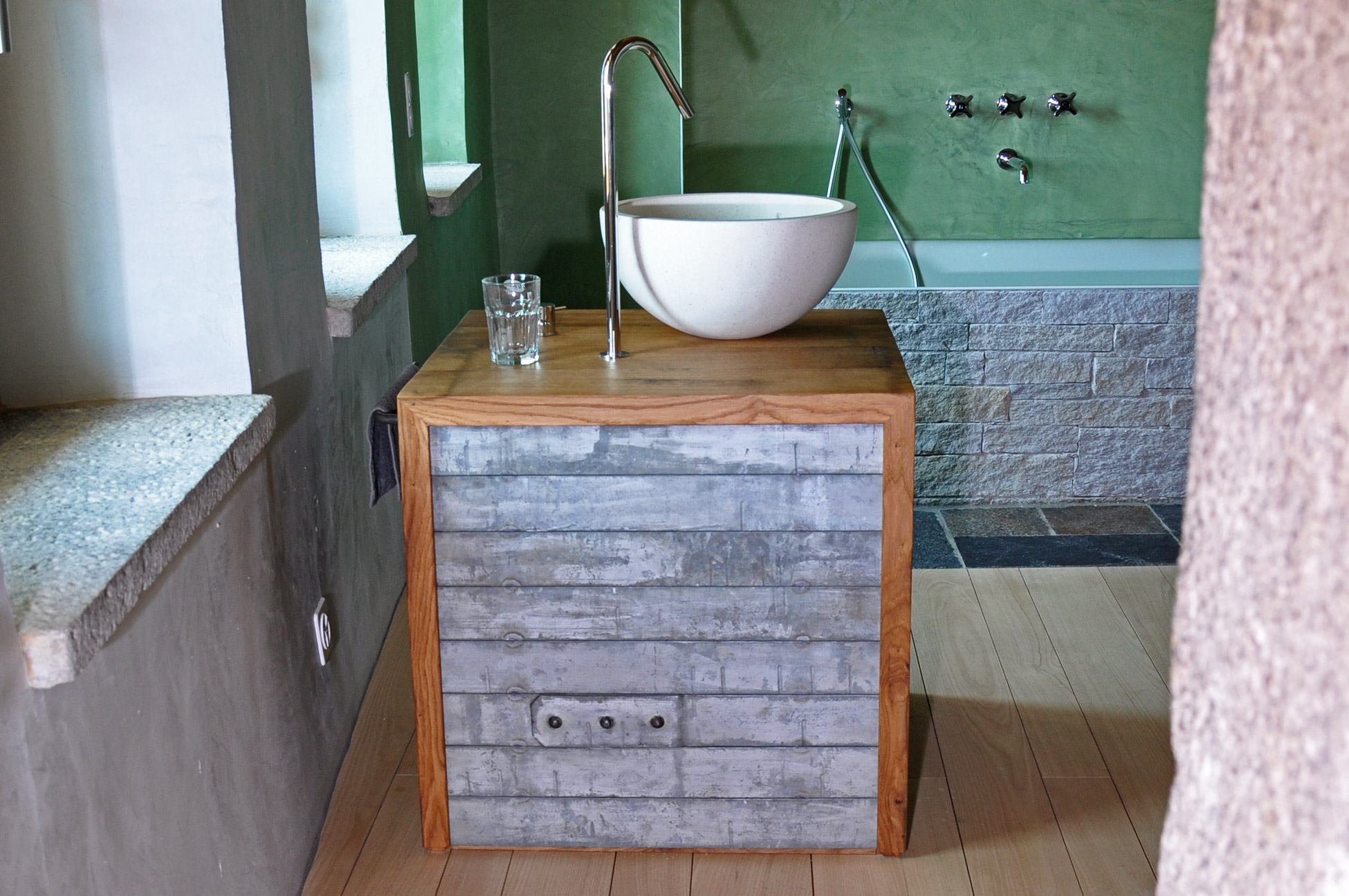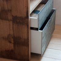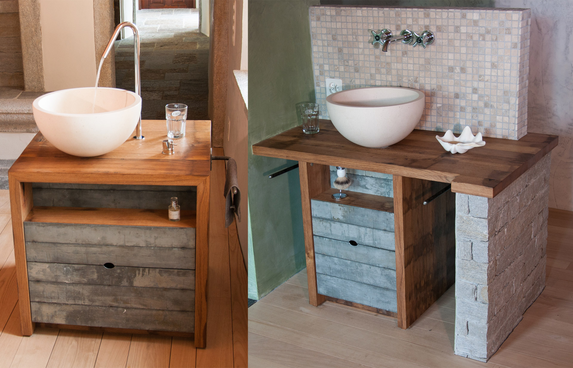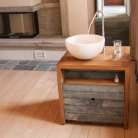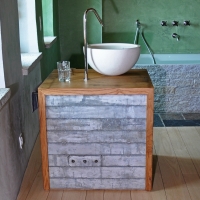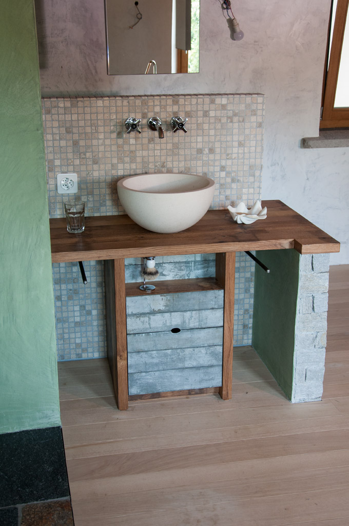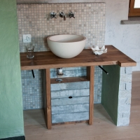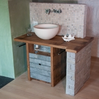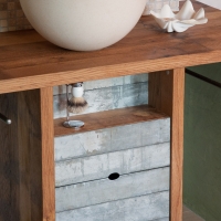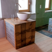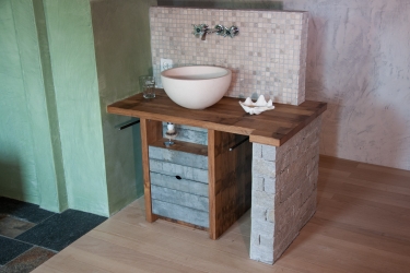 Die Möbel Nr. 207 und 208 sind aus Fassdauben eines alten Mostfasses hergestellt. Die Fronten sind aus feuerverzinkten Fassreifen geschmiedet. Die beiden Badmöbel wurden exakt nach den Bedürfnissen der Kundin von uns entworfen und umgesetzt.