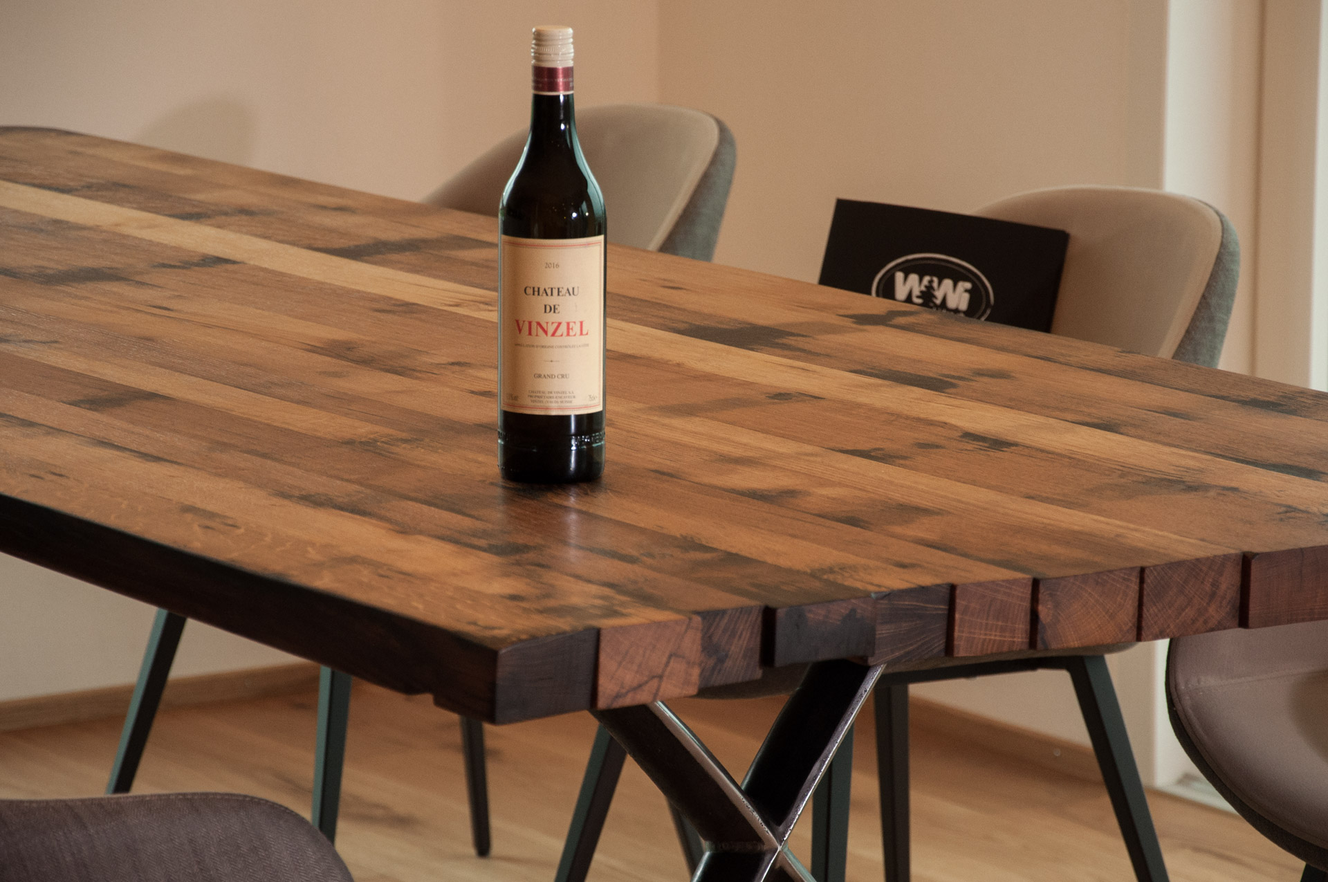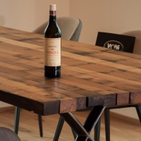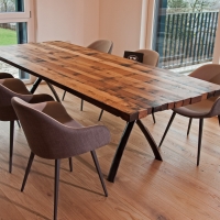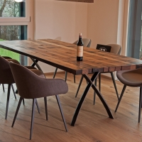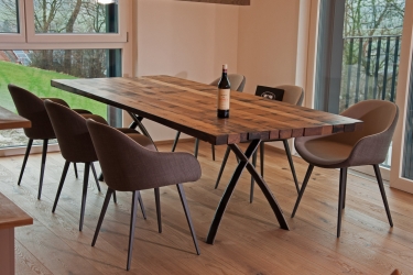 Immer wieder beliebt an unseren Tischen sind die einzigartigen aus Fassreifen geschmiedeten Tischfüsse "Masli". Dank der X-Form bleibt viel Beinfreiheit und die Tischplatte wirkt sehr leicht.