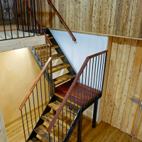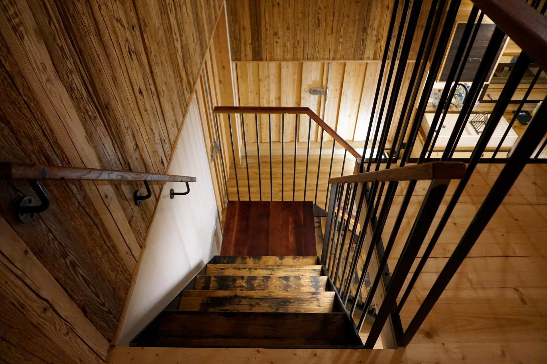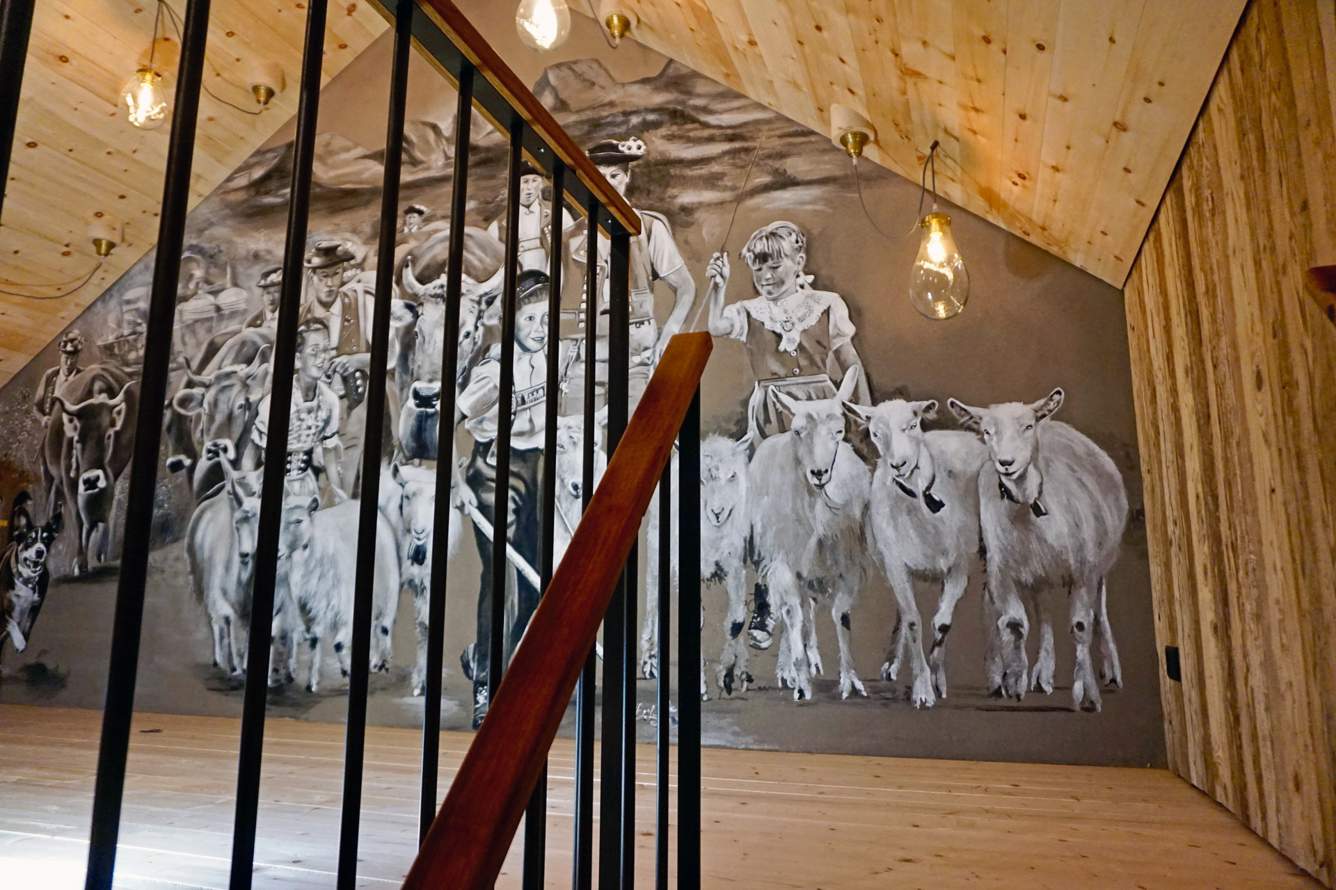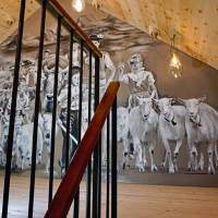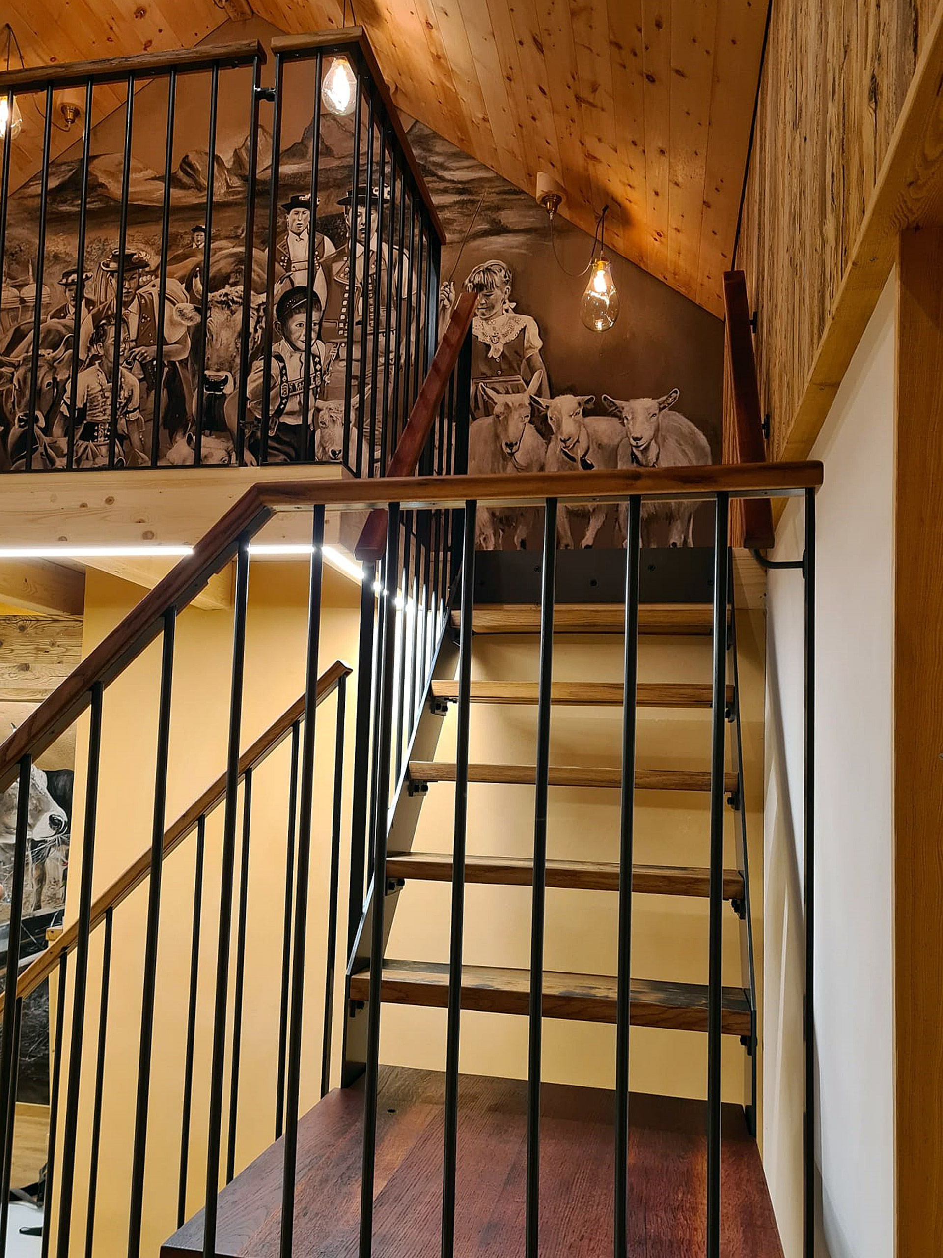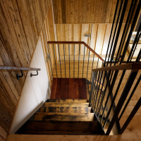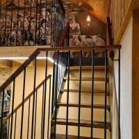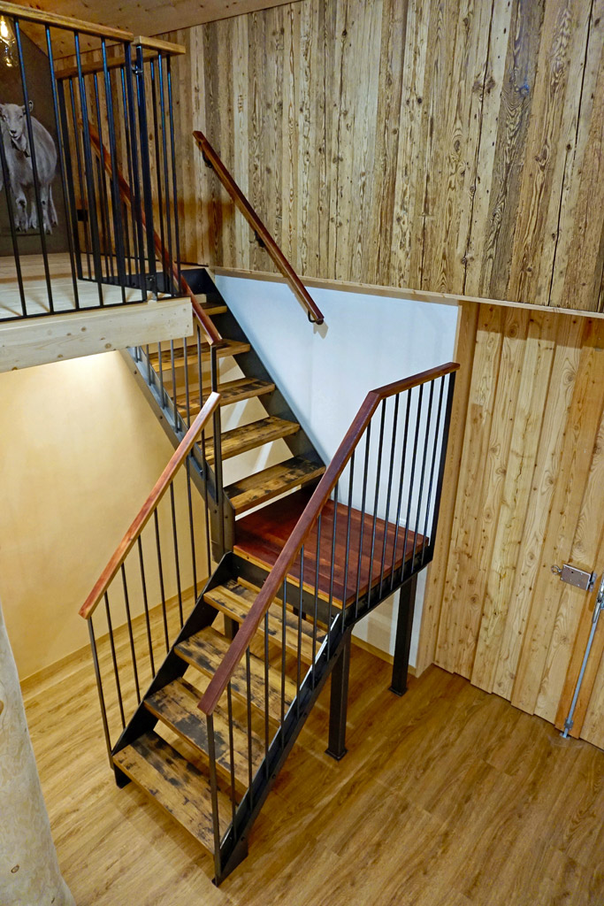 Diese Treppe führt zu einem Wandgemälde von Tom Eisenhut (Poesie in Lehm). Aber auch die Treppe ansich ist ein Kunstwerk. Die Stahlkonstruktion wurde von Mundy Nussbaumer geplant und umgesetzt. Die Treppentritte sind aus Fassdauben und das Zwischenpodest aus einem Fassboden, wodurch das schöne Weinrot zum Vorschein kommt.