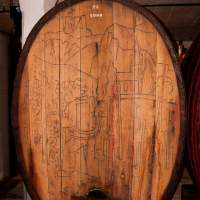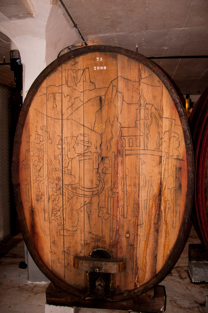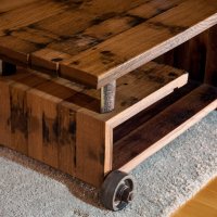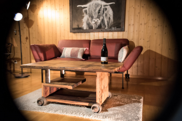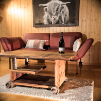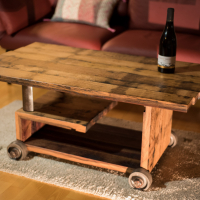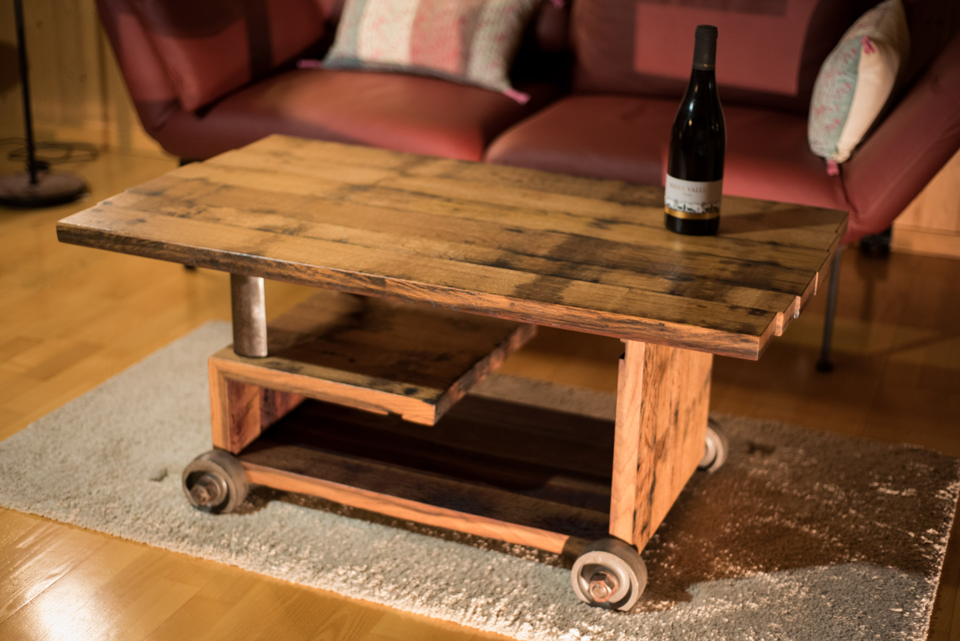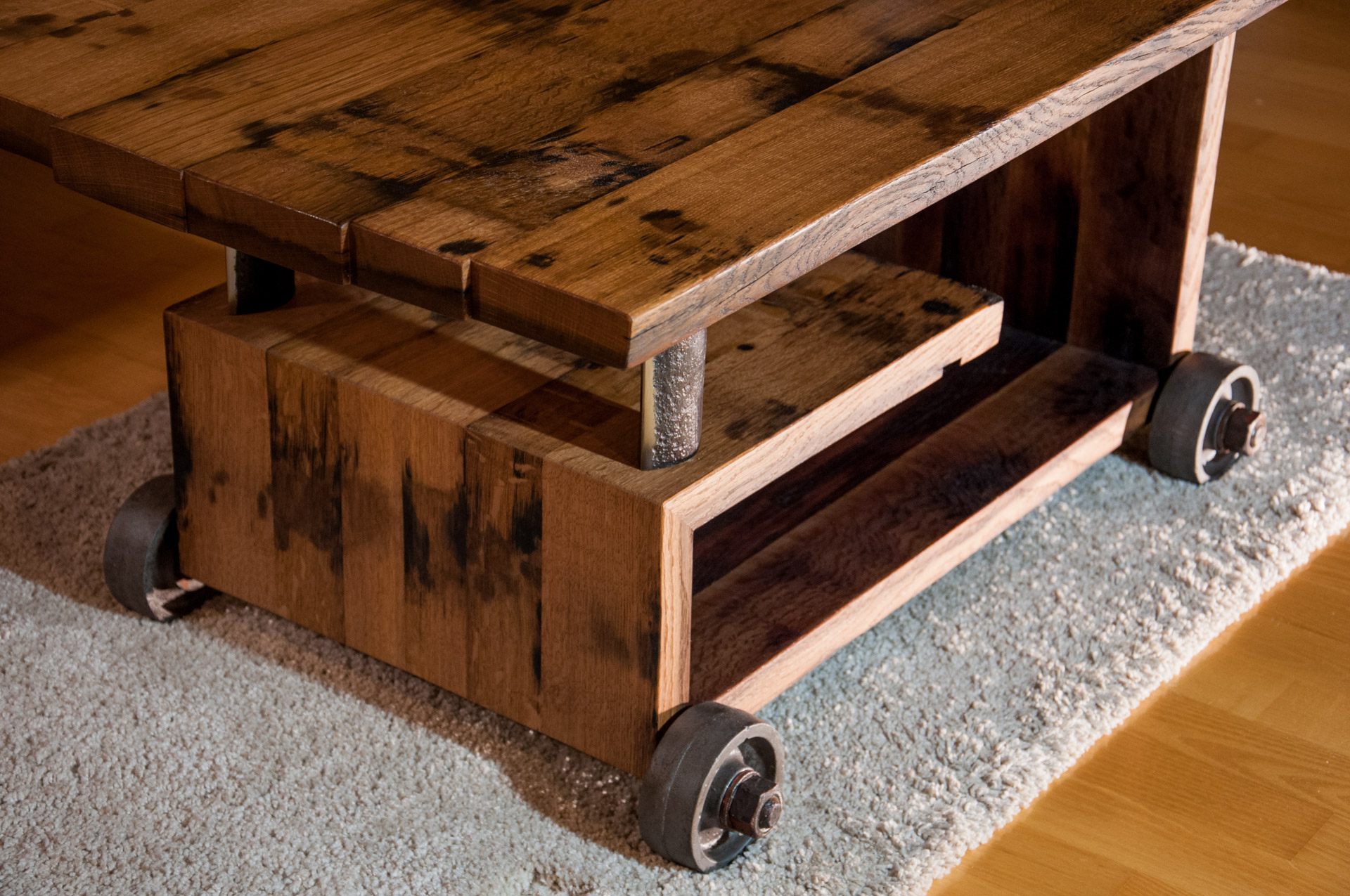 Dieser Salontisch stammt aus einem Weinfass vom Weinkeller Emil Nüesch AG in Balgach SG. Die Verbindungen zwischen dem Holz sind aus geschmiedeten Fassreifen und die Räder aus Eisen.