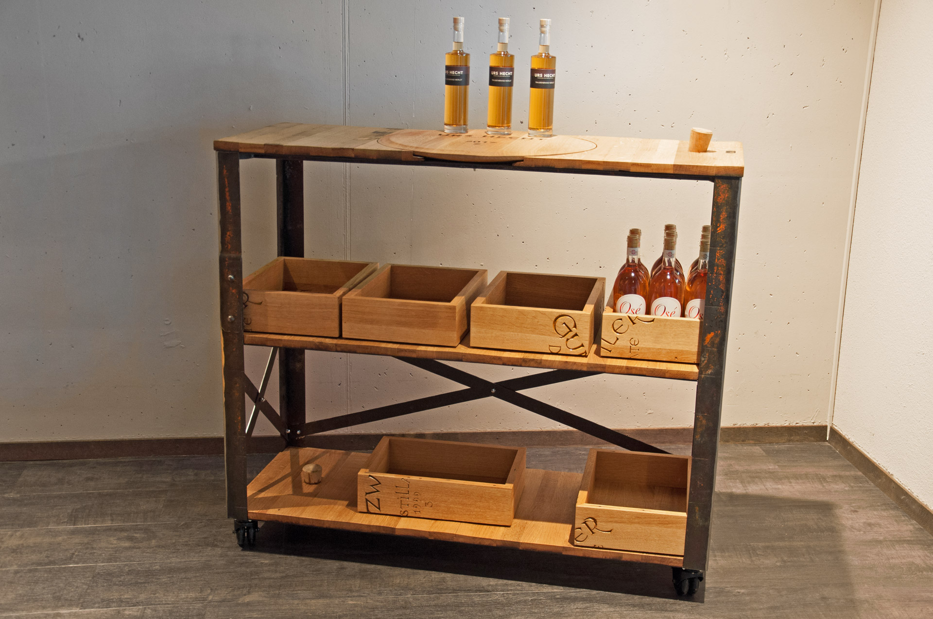 Ein Brandwagen der speziellen Art. In Zusammenarbeit mit dem Edelbrenner und Destillateur Urs Hecht aus Gunzwil ist dieser Brandwagen entstanden. Der Fasstischmacher Walter Amrhyn hat mit den ausgedienten Fässern von Hecht's Destillaten ein Möbel gefertigt, dass eine Degustation im BrandAtelier in Gunzwil zum Erlebnis macht. Dank dem drehbaren Fassboden oben in der Mitte und den Rollen unten kann man die Flaschen mit den edlen Bränden auf allen Seiten präsentieren. Der Rahmen des Wagens besteht aus alten Fassreifen, die wir nebst den Fässern ebenfalls wieder verwenden. Denn auch sie haben eine einzigartige Patina und können nur dank aufwändiger Handarbeit von unserem Fassreifenschmied in eine neue Form gebracht werden.