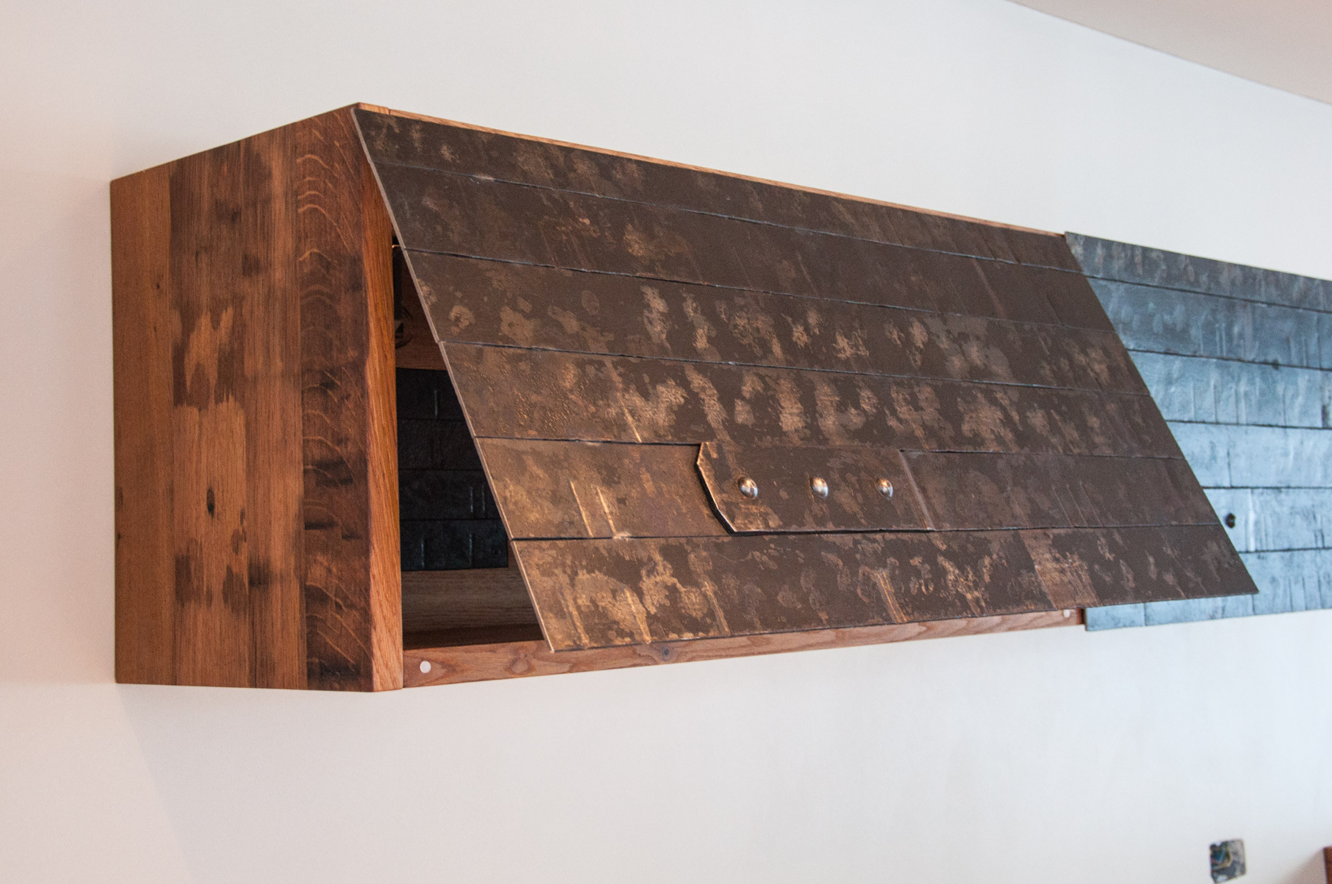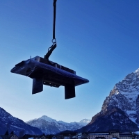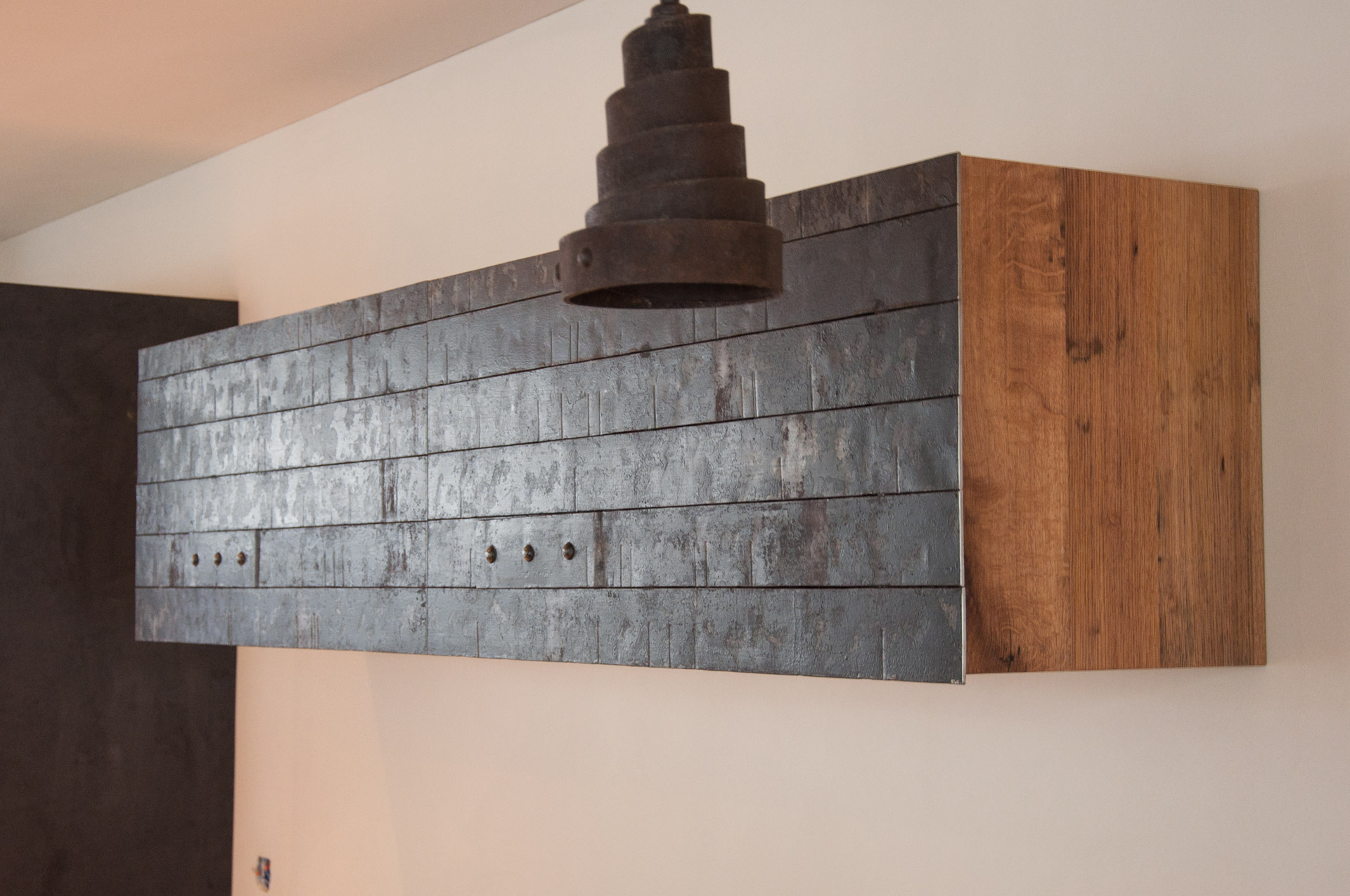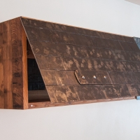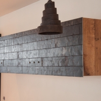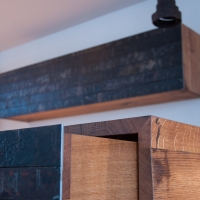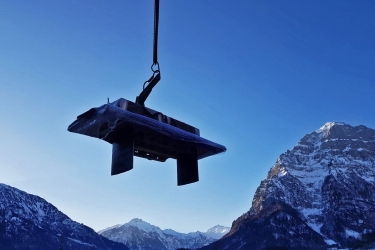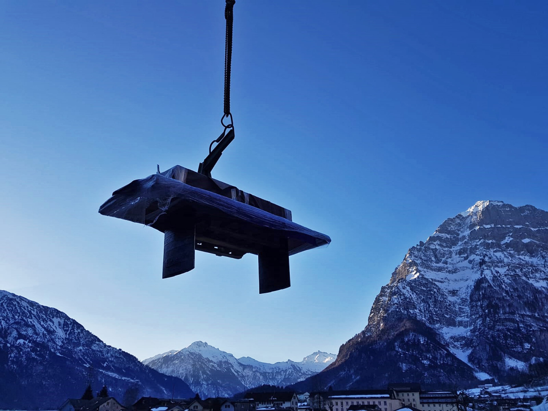 Tisch Nr. 220 hat mit einem Baustellenkran sein neues Zuhause bezogen. Während der Fahrt nach oben geniesst er die Aussicht in die Glarner Alpen. Nebst dem Tisch gibt es zwei Baraufbauten und ein Wandboard aus Fassdauben in der neuen Wohnküche. Fasszinierend...