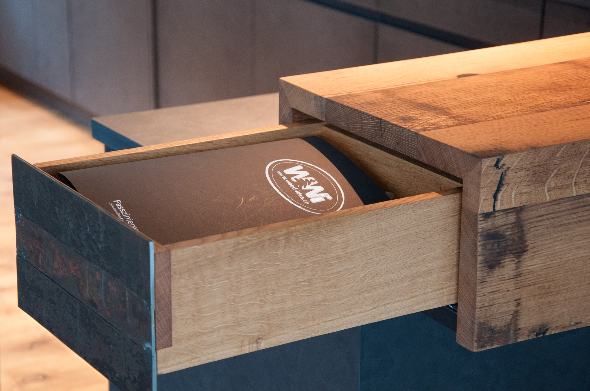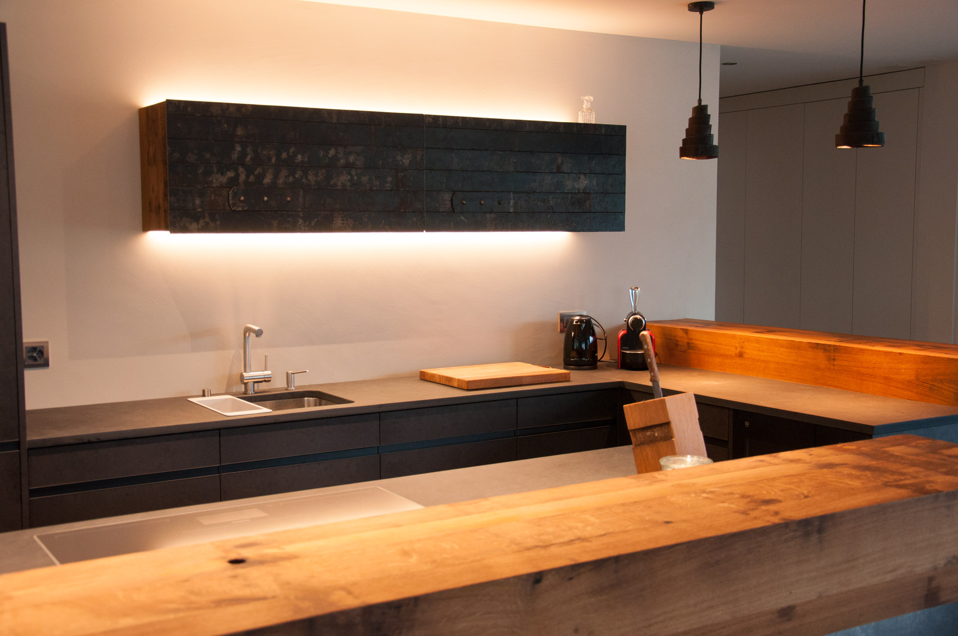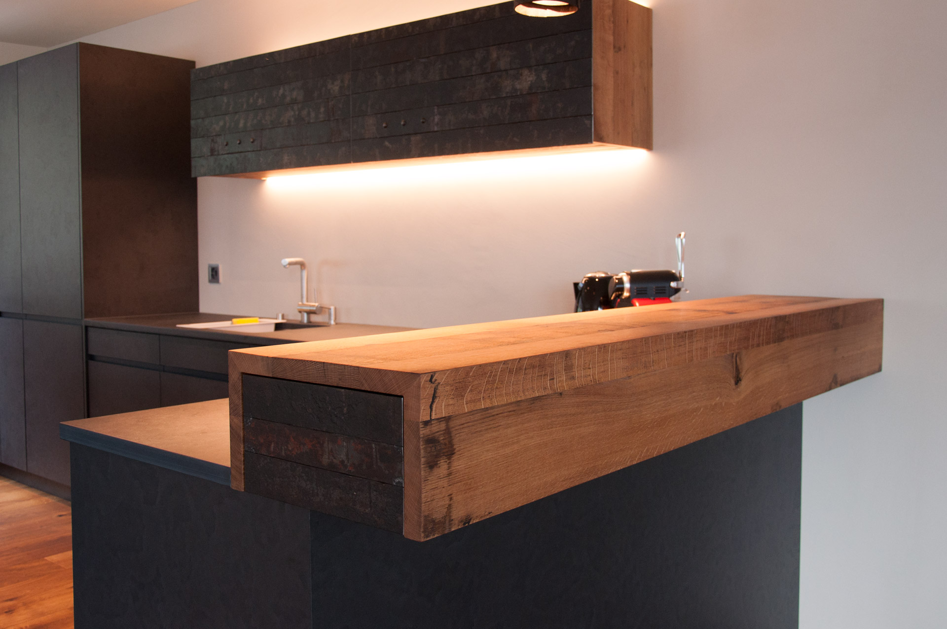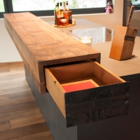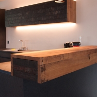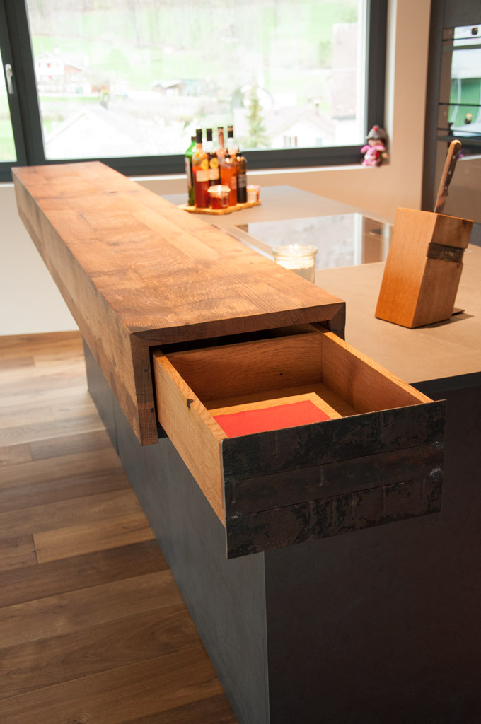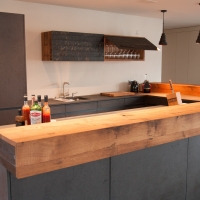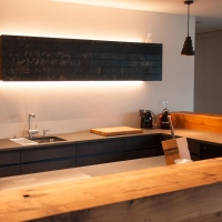 Fassholz wirkt am Meisten, wenn es dezent eingesetzt wird. So durfte der Fasstischmacher in Zusammenarbeit mit dem Küchenbauer und dem Kunden eine Küche realisieren. Die beiden Baraufbauten haben eine integrierte Schublade und das Wandboard mit den Fronten aus Fassreifen bietet ebenfalls Stauraum.