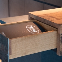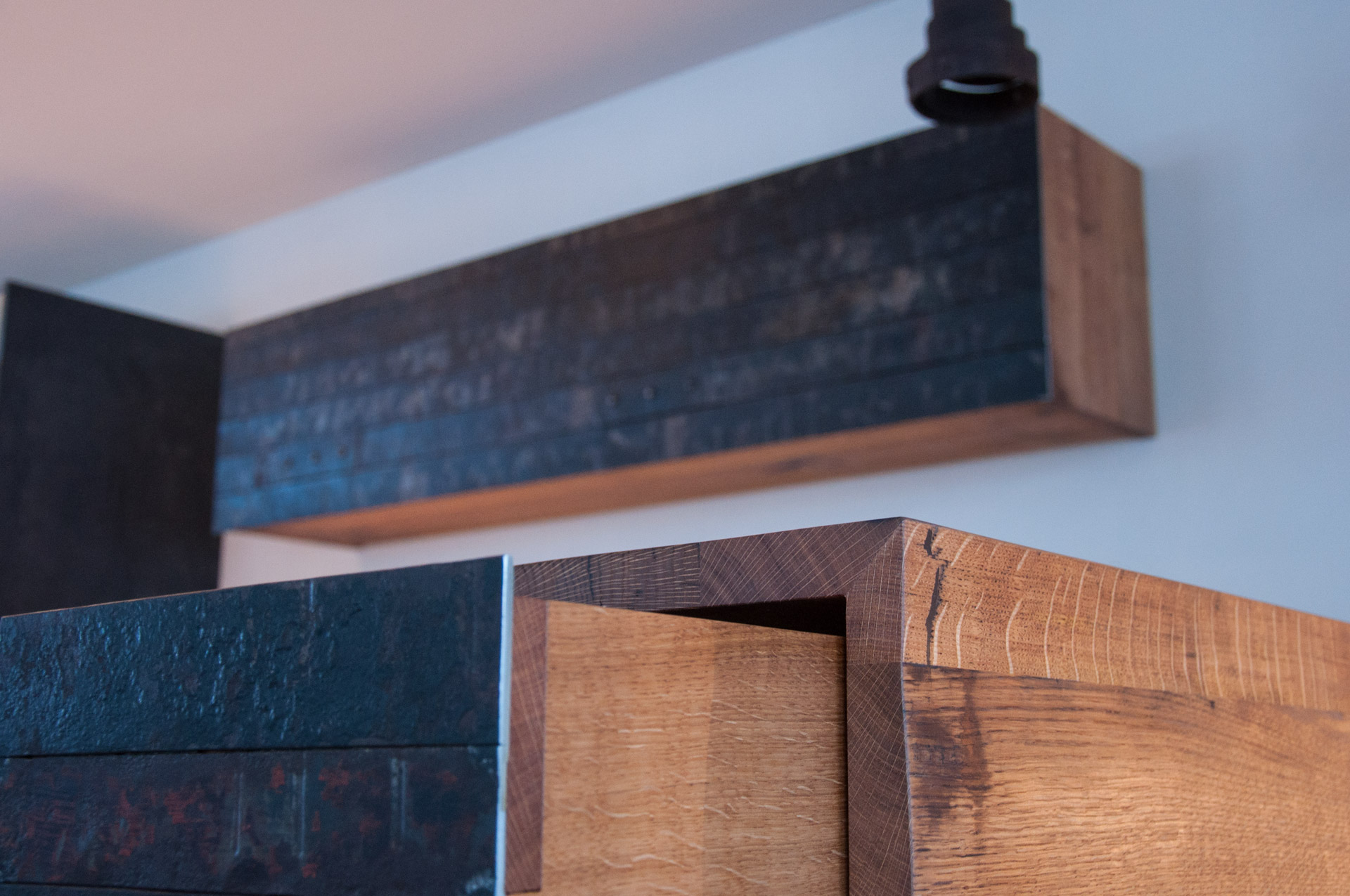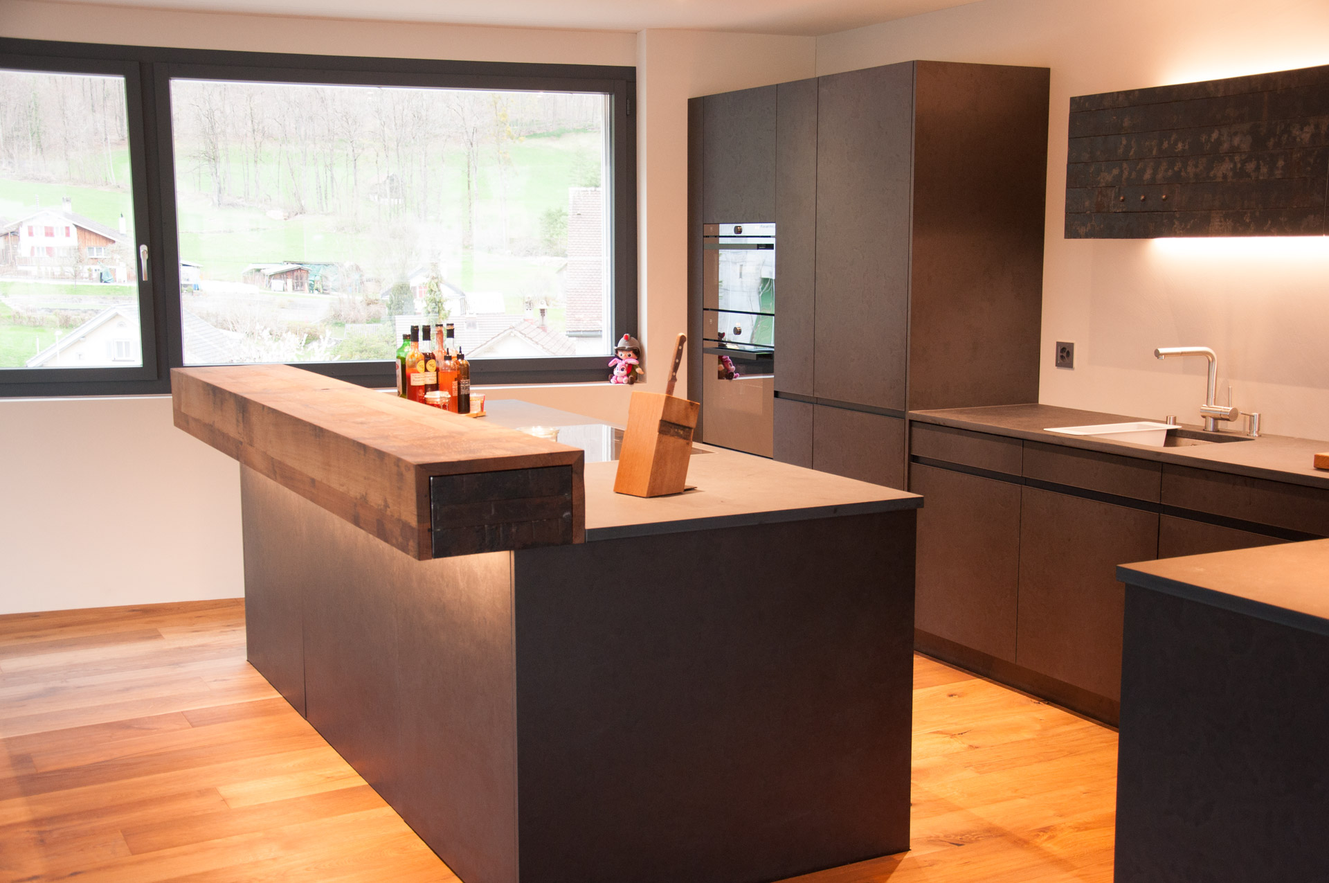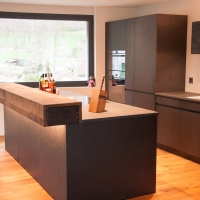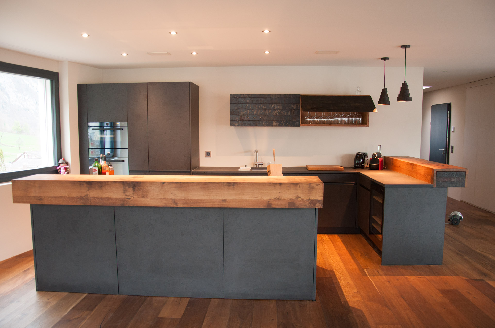 Fassholz wirkt am Meisten, wenn es dezent eingesetzt wird. So durfte der Fasstischmacher in Zusammenarbeit mit dem Küchenbauer und dem Kunden eine Küche realisieren. Die beiden Baraufbauten haben eine integrierte Schublade und das Wandboard mit den Fronten aus Fassreifen bietet ebenfalls Stauraum.