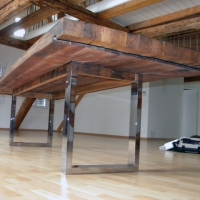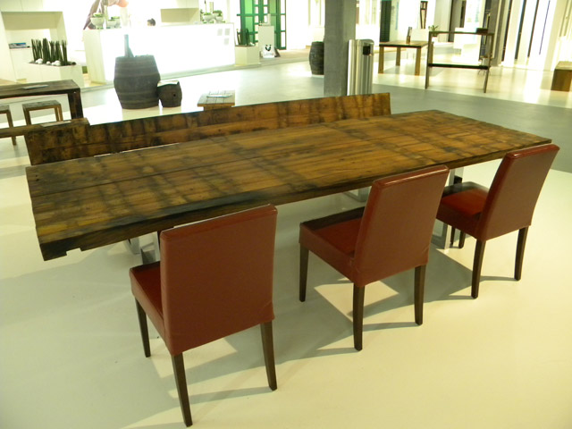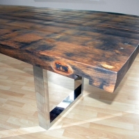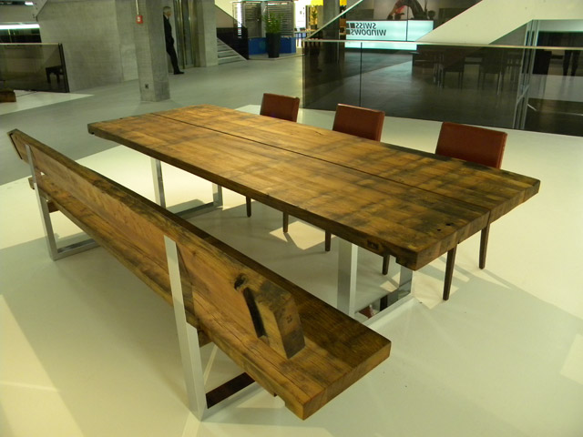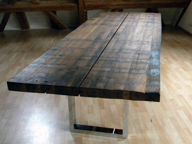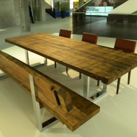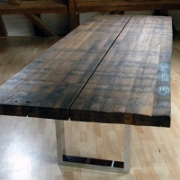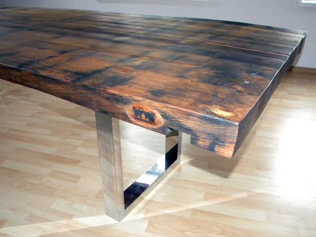 Sitzbank mit RückenlehneOberfläche eichengoldig, leicht gewellt, Fassreifenabdrücke, Äste, Risse, Wurm-löcher, Fassaussenseite, 6 Dauben längs, Bankgestell Chromstahl glänzend,