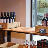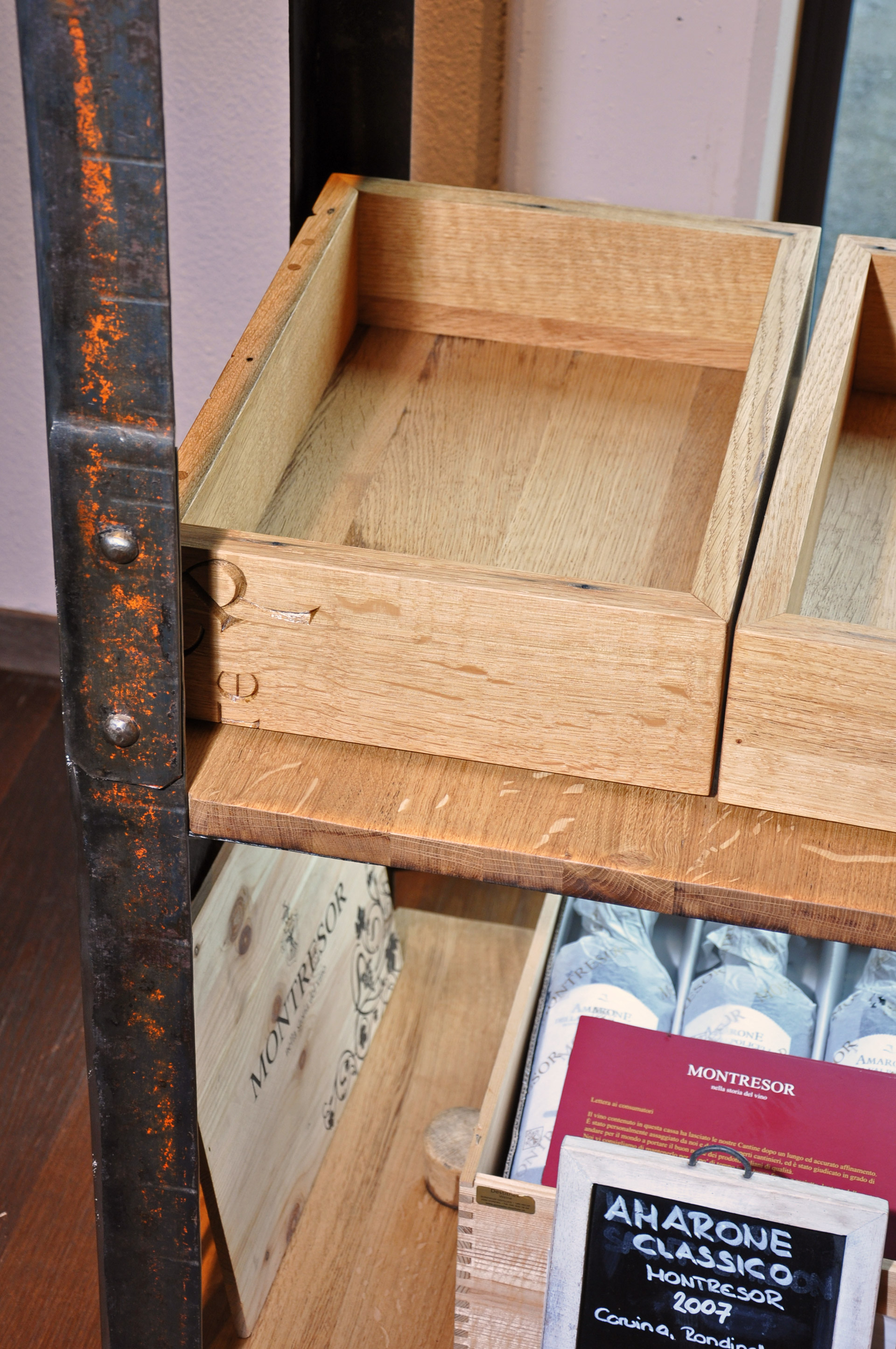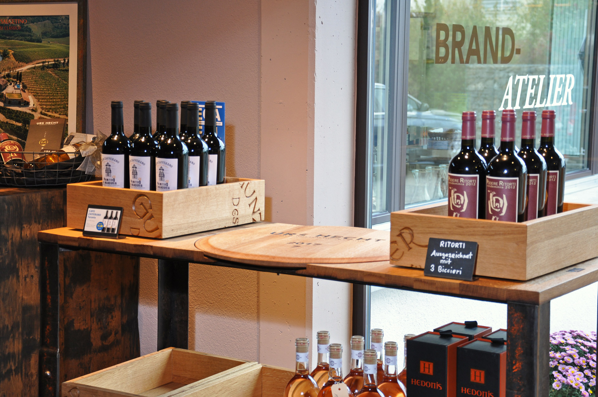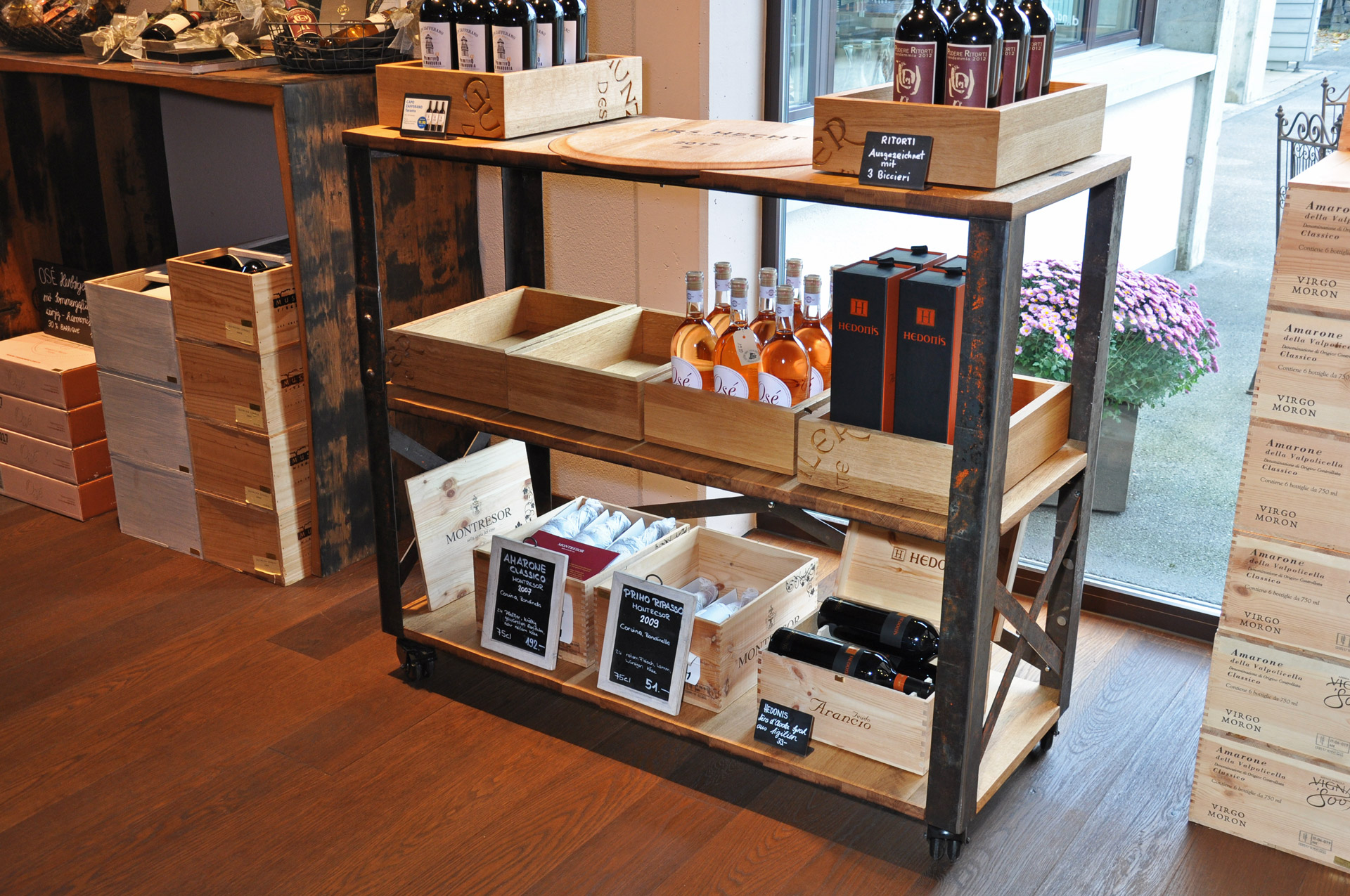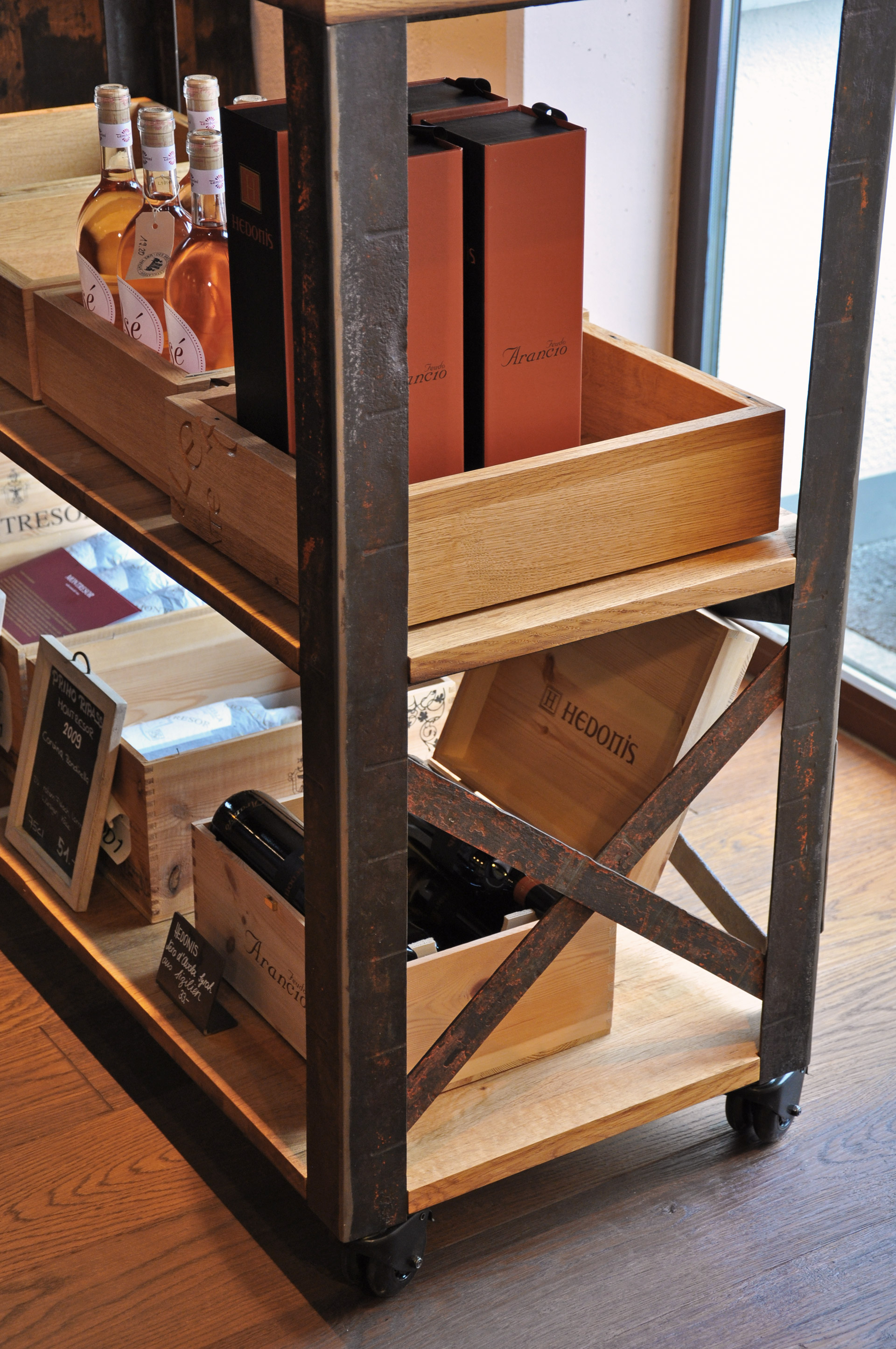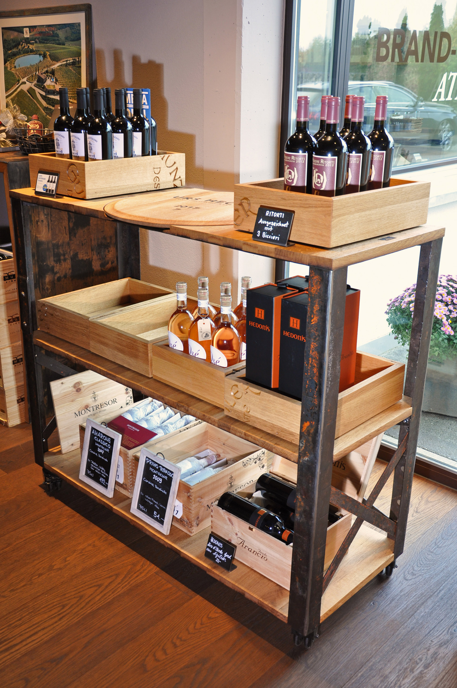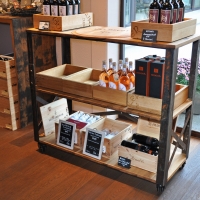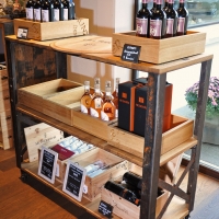 BrandwagenOberfläche eichengoldig-hell, kleine Äste, Holzspiegel, 2 Zapfenlöcher, Fassaussenseite, Dauben quer, Drehscheibe mit Original Inschrift, Gestell aus Fassreifen geschmiedet, rostig-Bleimennige,
