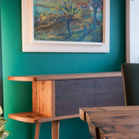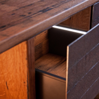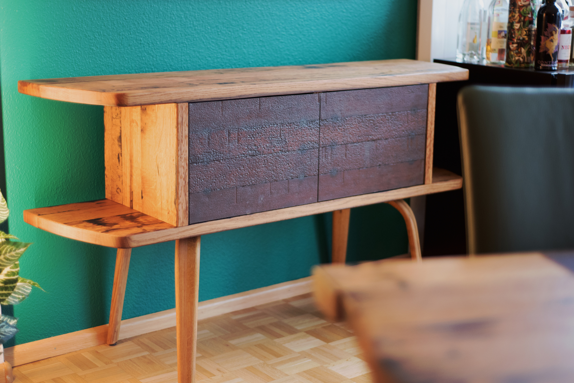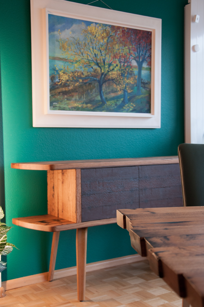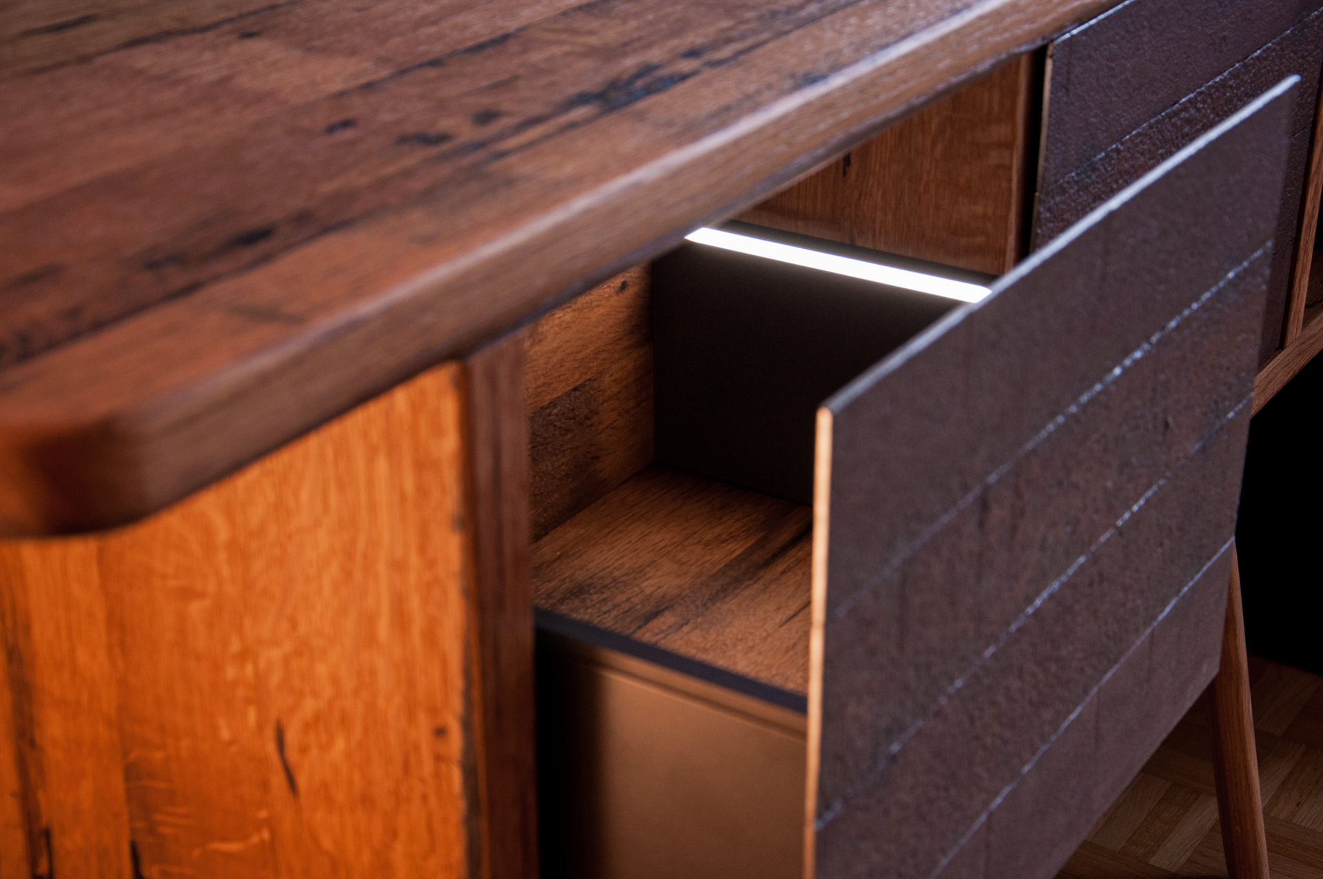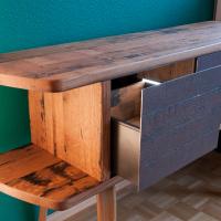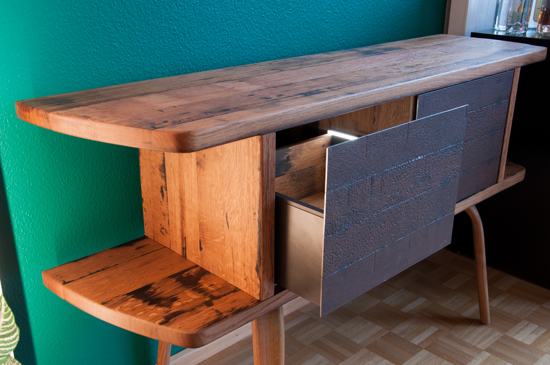 Fassmöbel mit Schubladenfronten aus alten Fassreifen und Füssen aus gebogenem FassholzSie haben Interesse?