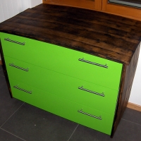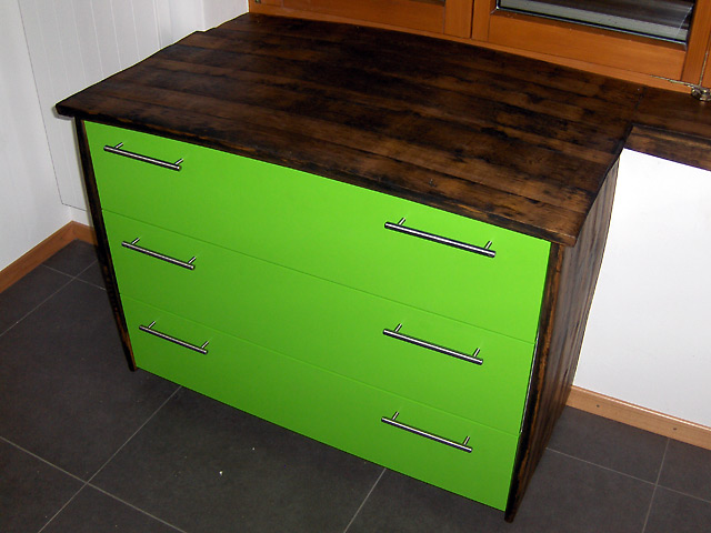 Möbeleinfassung aus FassdaubenEichengoldig bis Fassdunkel, Daubenaußenseite, Fassreifenabdrücke