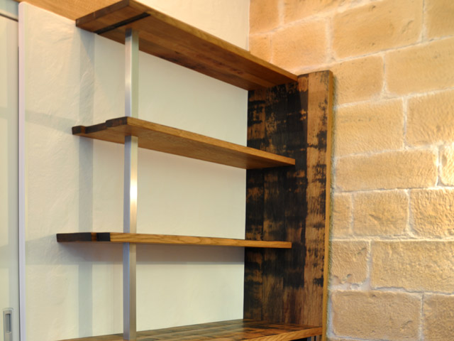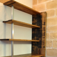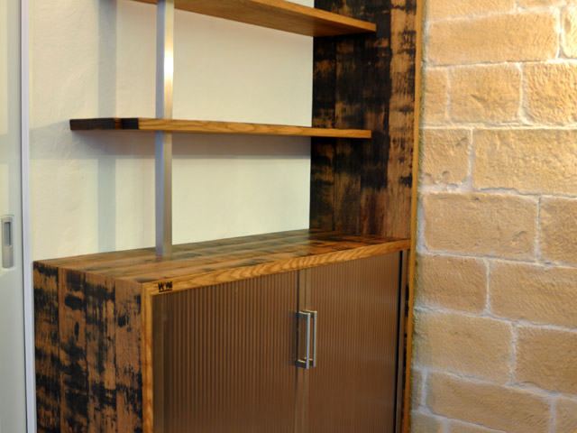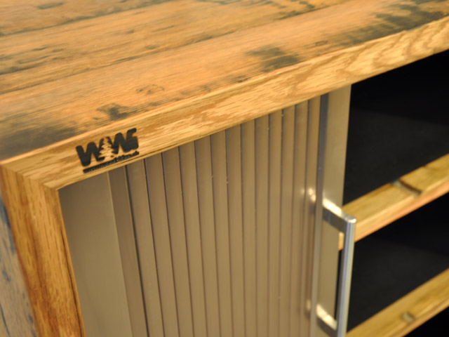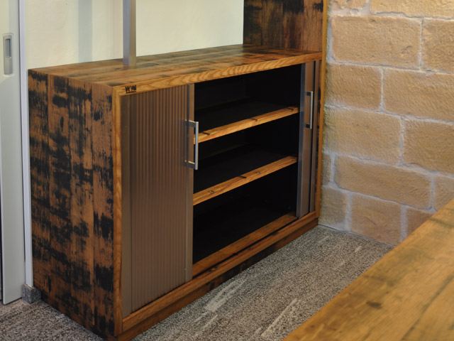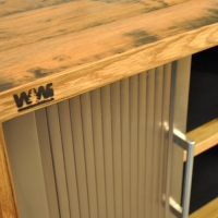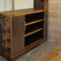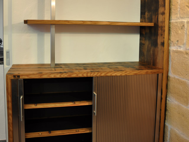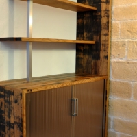3 Tablare sichtbar mit einer Chromstahl-stange verbunden, 2 Tablare mit alten Dübellöcher im Korpus, durch Rollos beidseitig verschliessbar