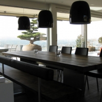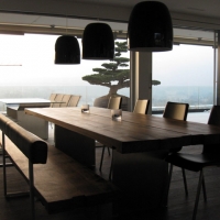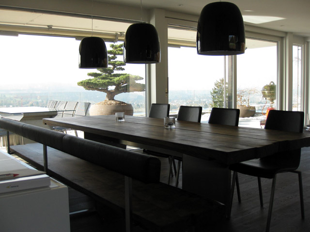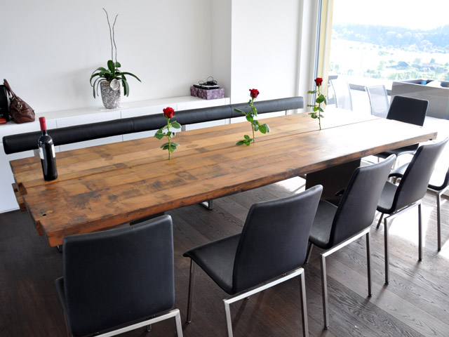 Sitzbank Oberfläche leicht gewellt, eichengoldig bis dunkel, Äste, Risse, Spiegel, Fassreifenabdrücke, Fassaussenseite 4 Dauben längs Beine aus Chromstahlwangen matt 2x geölt mit Biofa Hartoil