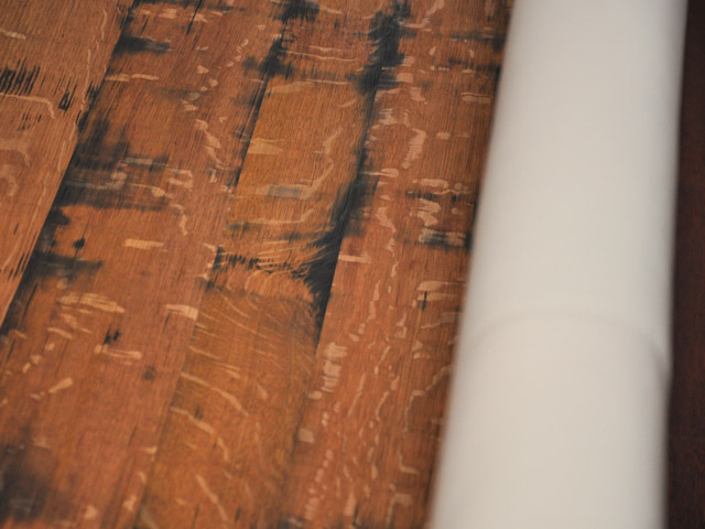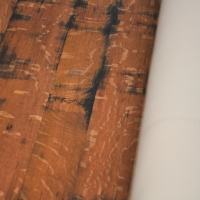 Oberfläche leicht gewellt, eichengoldig, Äste, Risse, Spiegel, Fassreifenabdrücke, Fassaussenseite, 4 Dauben längs