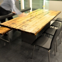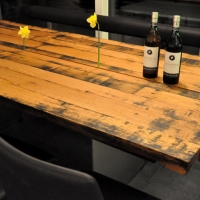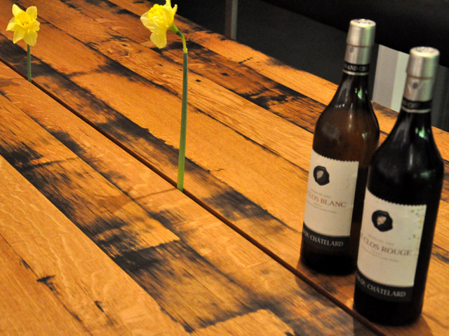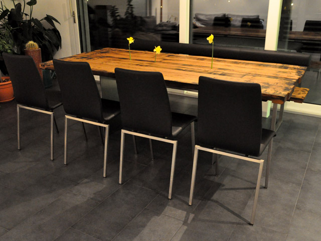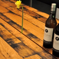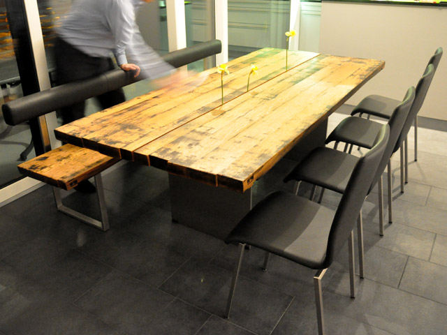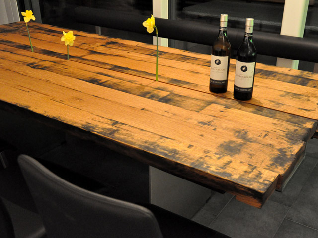 Oberfläche leicht gewellt, eichengoldig bis dunkel, Äste, Risse, Wurmlöcher, Spiegel, Fassreifenabdrücke, Fassaussenseite, 9 Dauben längsMitte Spalt mit 3 Bolzen verbunden