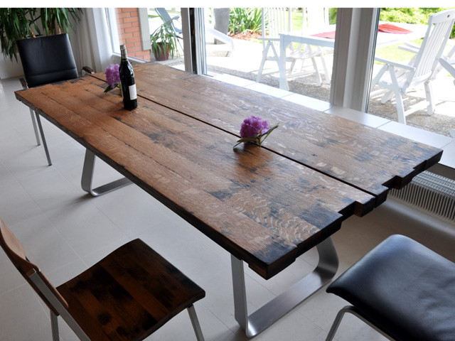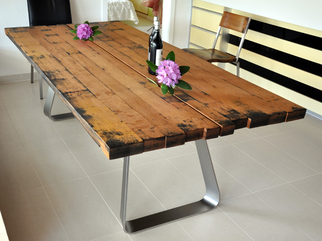 Oberfläche leicht gewellt, eichengoldig hell bis dunkel, Risse, Spiegel, Fassreifenabdrücke, Fassaussenseite